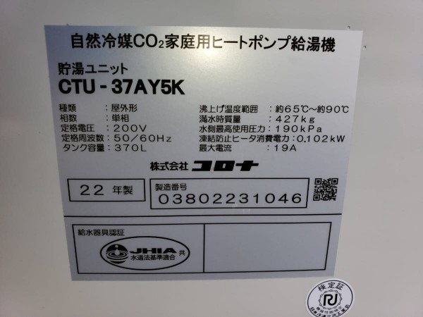 板野町唐園西川上 コロナエコキュート→自然冷媒CO2家庭用ヒートポンプ給湯機 貯湯ユニットCTU-37AY5K エコキュート交換工事
