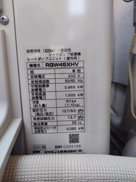 勝浦町坂本岡田 ダイキン自然冷媒CO2家庭用ヒートポンプ給湯機ヒートポンプユニットRGW45XHV エコキュート交換工事