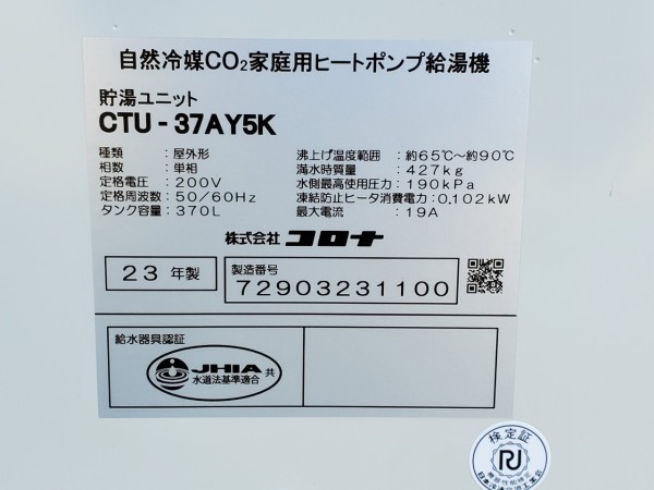 板野町唐園西川上 コロナ自然冷媒CO2家庭用ヒートポンプ給湯機貯湯ユニットCTU-37AY5K エコキュート交換工事