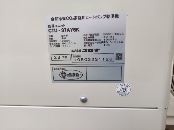 藍住町笠木東野 コロナ自然冷媒CO2家庭用ヒートポンプ給湯機貯湯ユニットCTU-37AY5K エコキュート交換工事