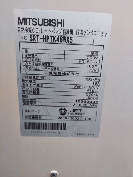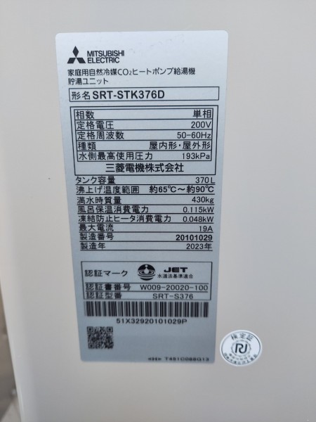 北島町中村本須 三菱電機エコキュートSRT-HPTK46WX5→三菱電機家庭用自然冷媒CO2ヒートポンプ給湯機貯湯ユニットSRT-STK376D エコキュート交換工事