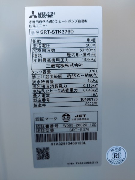 上板町神宅 三菱電機家庭用自然冷媒CO2ヒートポンプ給湯機貯湯ユニットSRT-STK376D エコキュート交換工事