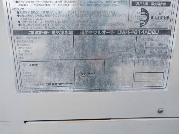 上板町神宅 コロナ電気温水器UWH-4614AD2U→コロナ自然冷媒CO2家庭用ヒートポンプ給湯機貯湯ユニットCTU-S46AY5K エコキュート交換工事