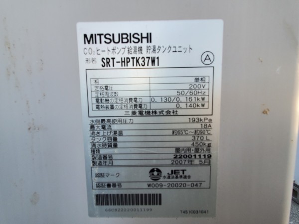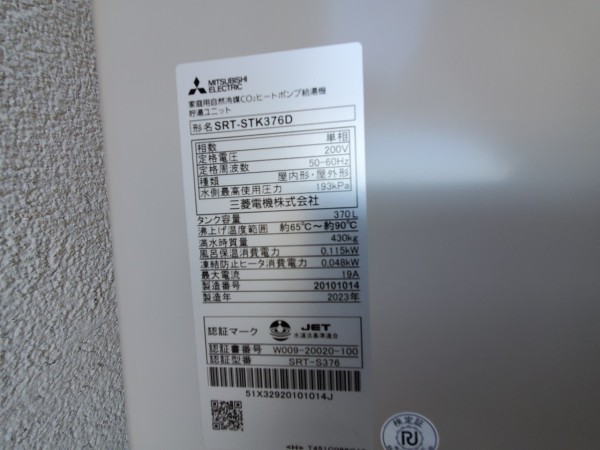 勝浦町坂本岡田 三菱電機エコキュート→三菱電機自然冷媒CO2家庭用ヒートポンプ給湯機貯湯ユニットSRT-STK376D エコキュート交換工事