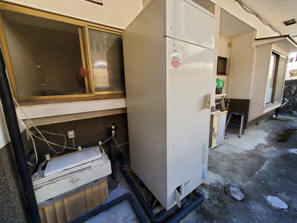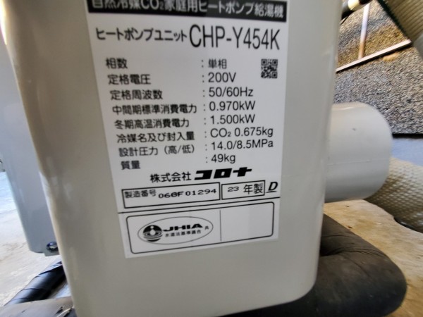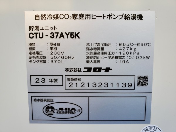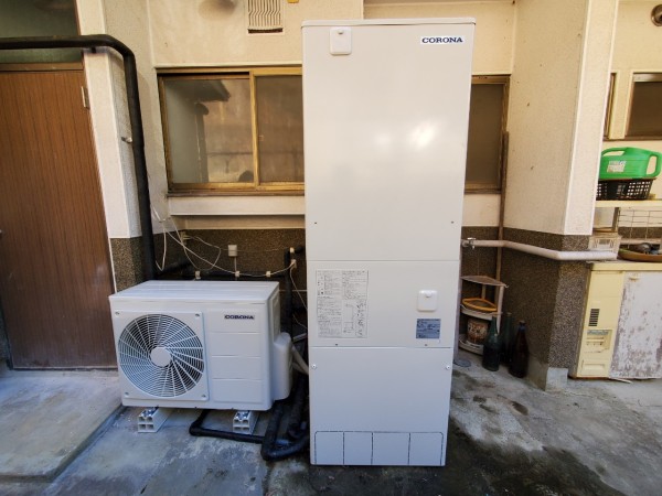 板野町川端千束 コロナ自然冷媒CO2家庭用ヒートポンプ給湯機ヒートポンプユニットCHP-Y454K、貯湯ユニットCTU-37AY5K エコキュート交換工事