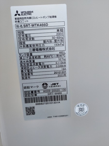 勝浦町坂本岡田 三菱電機自然冷媒CO2家庭用ヒートポンプ給湯機貯湯ユニットSRT-WTK466D、ヒートポンプユニット エコキュート交換工事