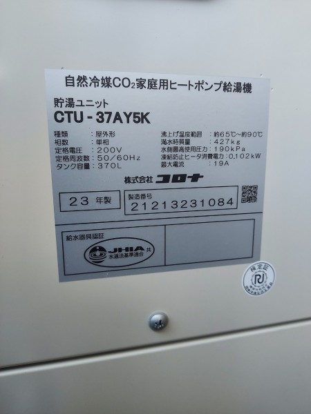 板野町唐園西川上 コロナ自然冷媒CO2家庭用ヒートポンプ給湯機貯湯ユニットCTU-37AY5K エコキュート交換工事