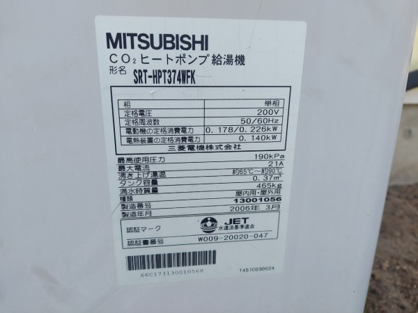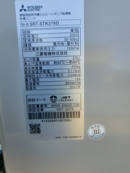 鳴門市撫養町木津 三菱電機エコキュート→三菱電機自然冷媒CO2家庭用ヒートポンプ給湯機 貯湯ユニットSRT-STK376D エコキュート交換工事
