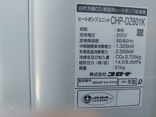 小松島市赤石町 コロナエコキュート→コロナ自然冷媒CO2家庭用ヒートポンプ給湯機ヒートポンプユニットCHP-DZ601K エコキュート交換工事