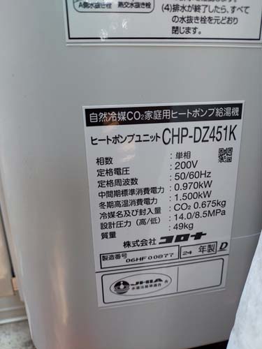 神山町4 コロナ自然冷媒CO2家庭用ヒートポンプ給湯機 貯湯ユニットCTU-37AZ1K、ヒートポンプユニットCHP-DZ451K エコキュート交換工事