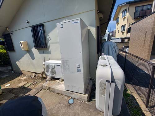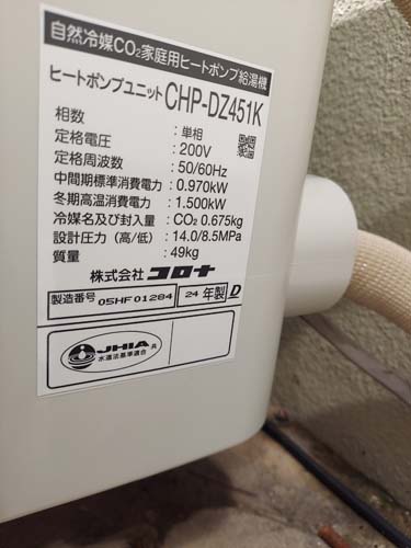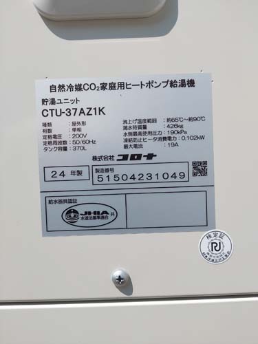 石井町浦庄国実 コロナ自然冷媒CO2家庭用ヒートポンプ給湯機 貯湯ユニットCTU-37AZ1K、ヒートポンプユニットCHP-DZ451K エコキュート交換工事