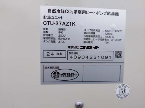 佐那河内村 コロナ自然冷媒CO2家庭用ヒートポンプ給湯機 貯湯ユニットCTU-37AZ1K エコキュート交換工事