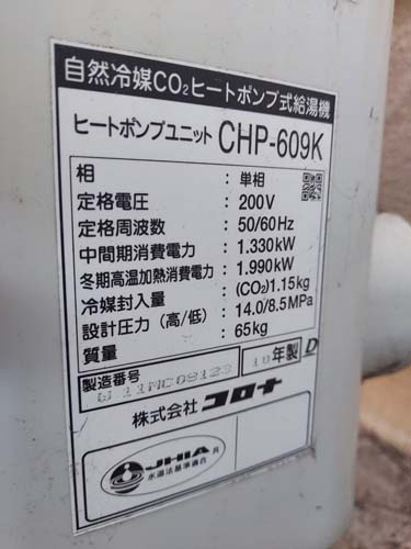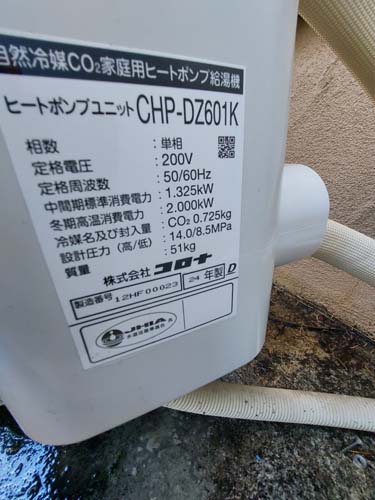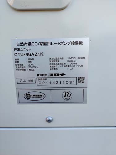 牟岐町橘 コロナエコキュートCHP-609K→コロナ自然冷媒CO2家庭用ヒートポンプ給湯機ヒートポンプユニットCHP-DZ601K、貯湯ユニットCTU-46AZ1K エコキュート交換工事