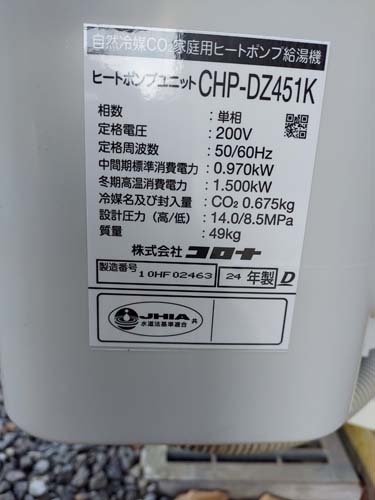 牟岐町橘 コロナ自然冷媒CO2家庭用ヒートポンプ給湯機 ヒートポンプユニットCHP-DZ451K エコキュート交換工事