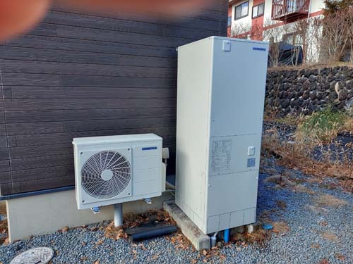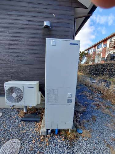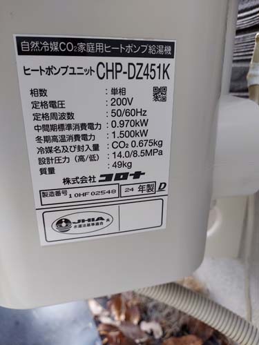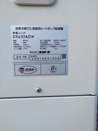 美馬市脇町 三菱電機エコキュート→コロナ自然冷媒CO2家庭用ヒートポンプ給湯機貯湯ユニットCTU-37AZ1K、ヒートポンプユニットCHP-DZ451K エコキュート交換工事