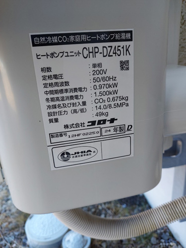 石井町浦庄国実 コロナ自然冷媒CO2家庭用ヒートポンプ給湯機 ヒートポンプユニットCHP-DZ451K エコキュート交換工事|徳島県のエコキュート専門交換工事店|徳島エコキュート交換ショップ補助金対応可能