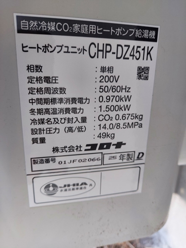 板野町川端千束 コロナ自然冷媒CO2家庭用ヒートポンプ給湯機 ヒートポンプユニットCHP-DZ451K エコキュート交換工事|徳島県のエコキュート専門交換工事店|徳島エコキュート交換ショップ補助金対応可能
