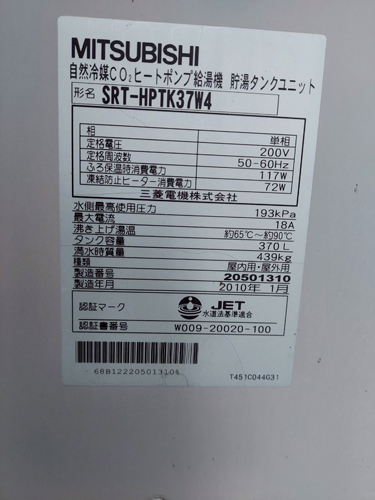 海陽町大里飯持 三菱電機自然冷媒CO2ヒートポンプ給湯機 貯湯タンクユニットSRT-HPTK37W4→コロナ自然冷媒CO2家庭用ヒートポンプ給湯機 ヒートポンプユニットCHP-DZ451K エコキュート交換工事