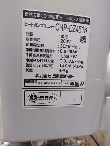 海陽町大里飯持 コロナ自然冷媒CO2家庭用ヒートポンプ給湯機 ヒートポンプユニットCHP-DZ451K エコキュート交換工事