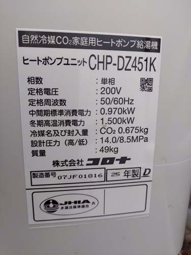 海陽町相川 コロナ自然冷媒CO2家庭用ヒートポンプ給湯機 ヒートポンプユニットCHP-DZ451K エコキュート交換工事|徳島県のエコキュート専門交換工事店|徳島エコキュート交換ショップ補助金対応可能